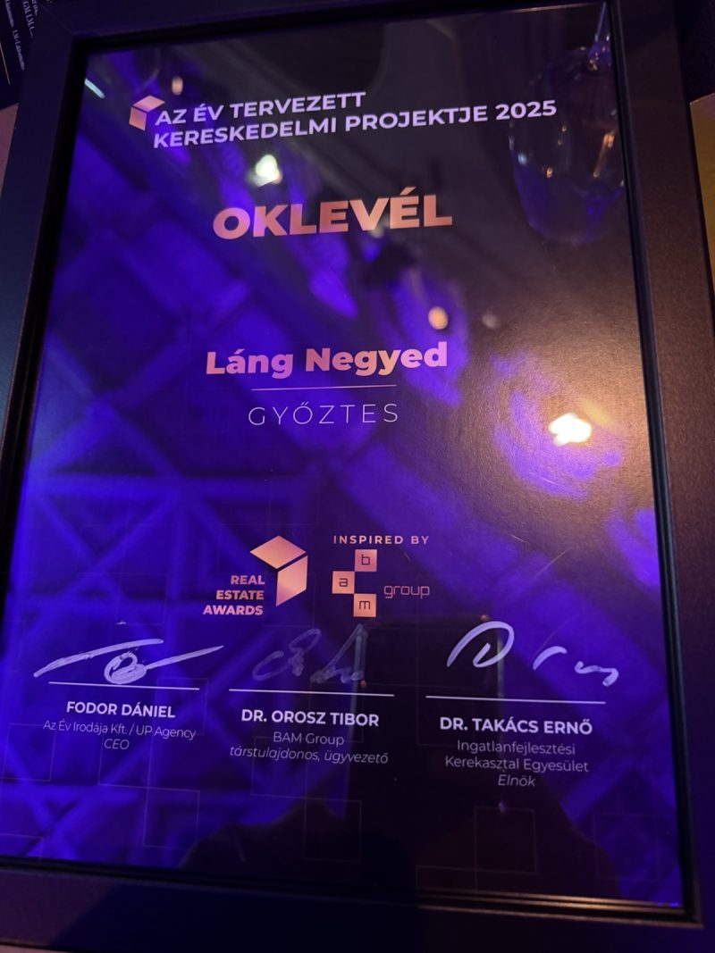A Paulinyi & Partners tervezésében megvalósuló Láng Negyed elnyerte az „Az Év Tervezett Kereskedelmi Projektje 2025” szakmai díjat. A Real Estates Awards elismerése a hazai ingatlan- és építőipari szektor egyik legnívósabb visszajelzése azon fejlesztések számára, amelyek komplexitásuk és városépítészeti jelentőségük szemléletük révén kiemelkednek a mezőnyből.